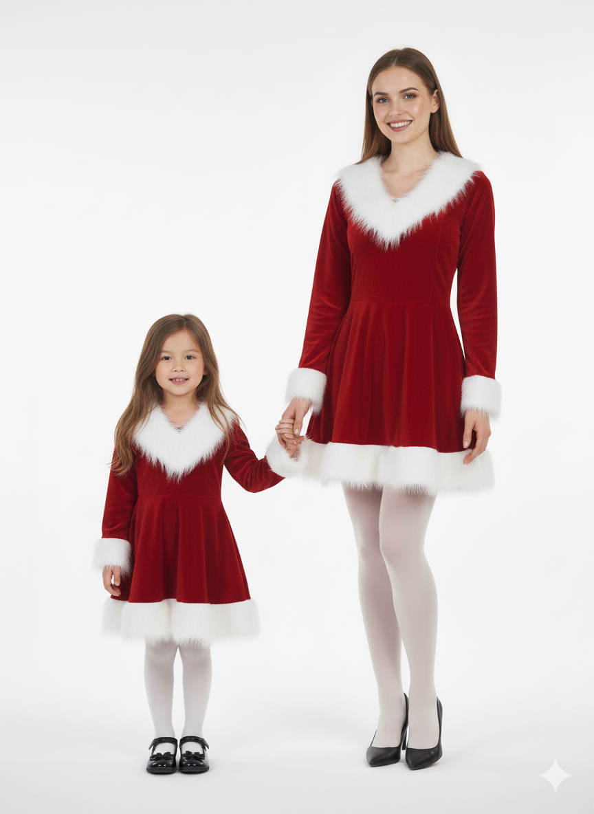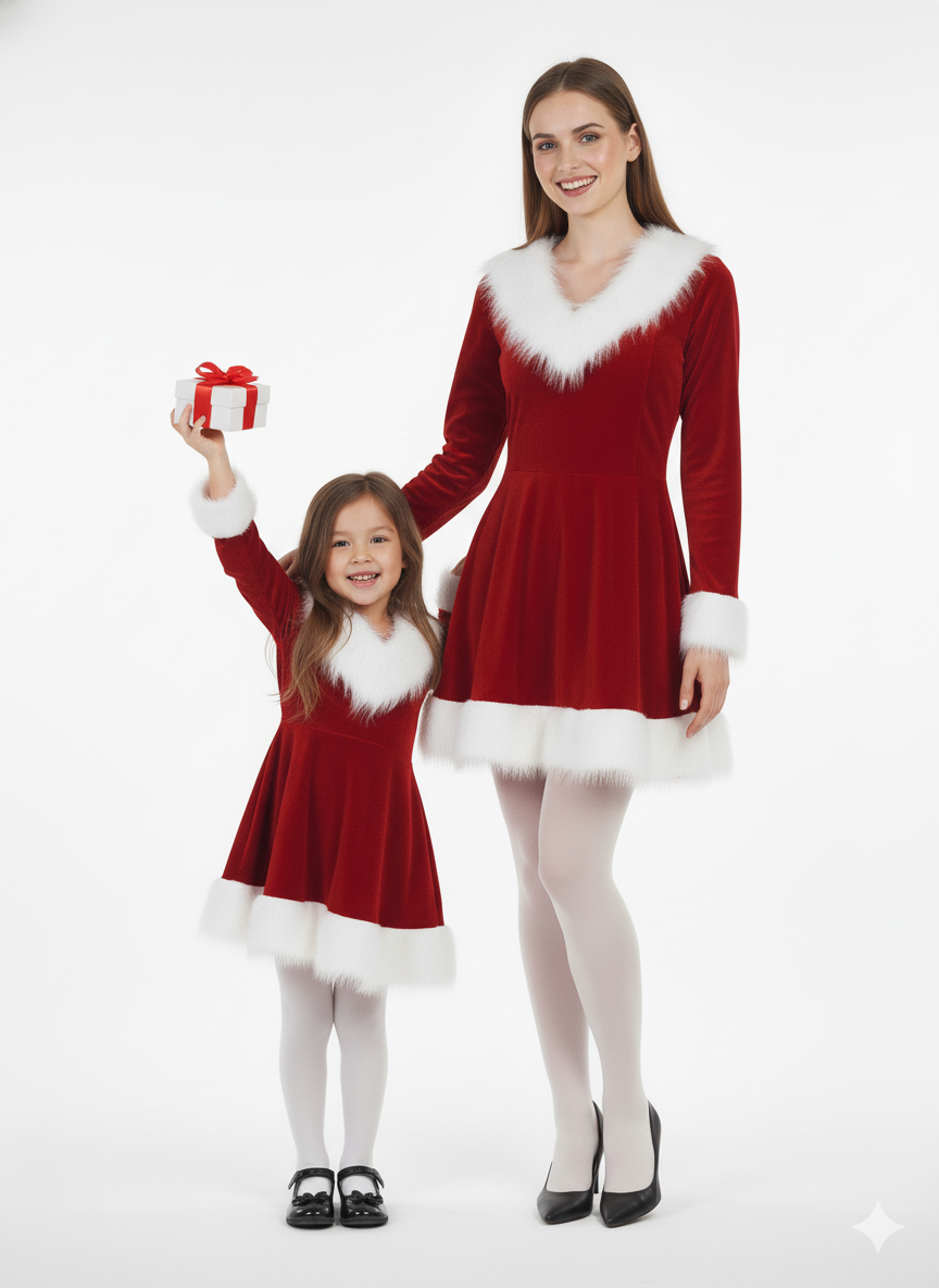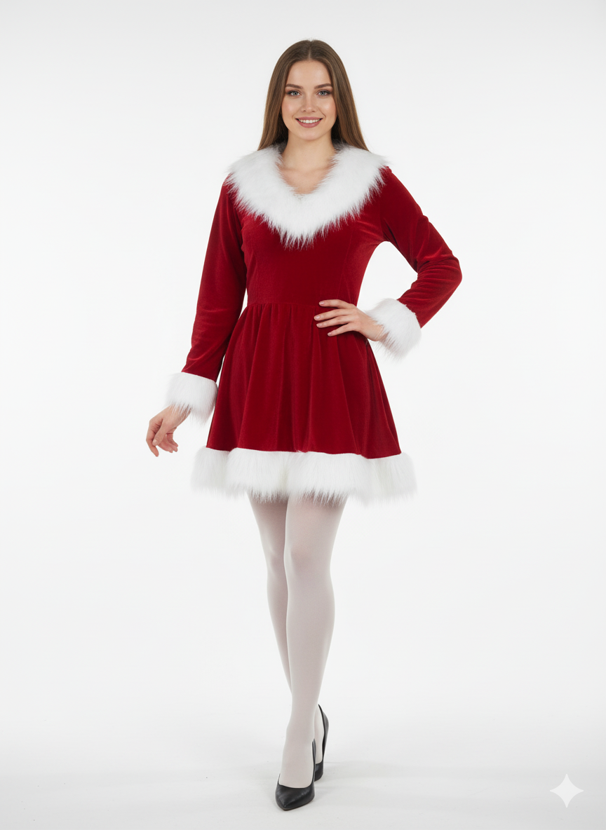 Eleganța sa este subliniată de bordura din blană albă pufoasă care încadrează gulerul și manșetele, aducând un detaliu de opulență specific iernii. Este alegerea perfectă pentru petrecerea de Crăciun, Revelion sau o ședință foto de familie, emanaând căldură și rafinament.
