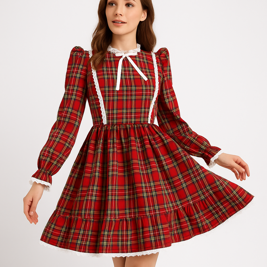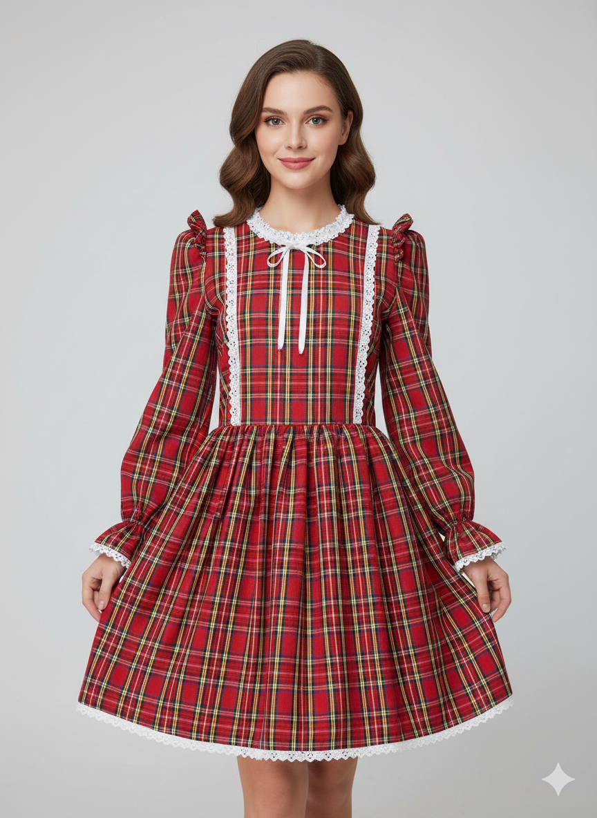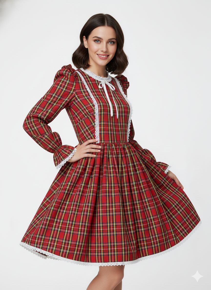 Inspirată din eleganța clasică a sărbătorilor de iarnă, rochia “Vintage Christmas” îmbină farmecul tradițional cu detalii delicate. Realizată din stofă tartan roșie, cu volane discrete la umeri și dantelă albă fină pe margini, această piesă aduce o notă de inocență și rafinament fiecărei apariții.